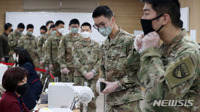 [서울=뉴시스] 이영환 기자 = 카투사 장병들이 제21대 국회의원선거 사전투표 시작일인 10일 오전 서울 용산구 용산구의회에 마련된 이태원제1동 사전투표소에서 사전투표를 하기 위해 본인확인을 하고 있다. 2020.04.10.