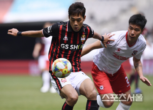 > FC서울 박주영이 30일 서울월드컵경기장에서 진행된 K리그1 2019 4라운드 상주 상무와의 경기에서 김영빈을 제치고 돌파를 시도하고있다. 2019.03.30. 상암