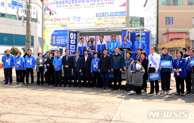 >		  【고성=뉴시스】차용현 기자 = 4.3 국회의원 보궐선거 통영.고성 선거구에 출마한 양문석 후보의 지원유세에 나선 이해찬 대표(윗줄 오른쪽 두번째)가 30일 오전  경남 고성군 고성읍 일원에서 더불어민주당 관계자들과 지지를 호소하고 있다. 2019.03.29.  con@newsis.com <저작권자ⓒ 공감언론 뉴시스통신사. 무단전재-재배포 금지.>