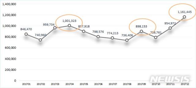 【세종=뉴시스】편도염 질환 월별 진료인원. (그래픽=국민건강보험공단 제공) photo@newsis.com【세종=뉴시스】임재희 기자 = 미세먼지가 많고 일교차가 커지는 환절기면 편도염 환자가 급증하는 것으로 나타났다. 2017년에도 연초 감소하던 환자수가 4월 들어 100만명까지 치솟았다.
